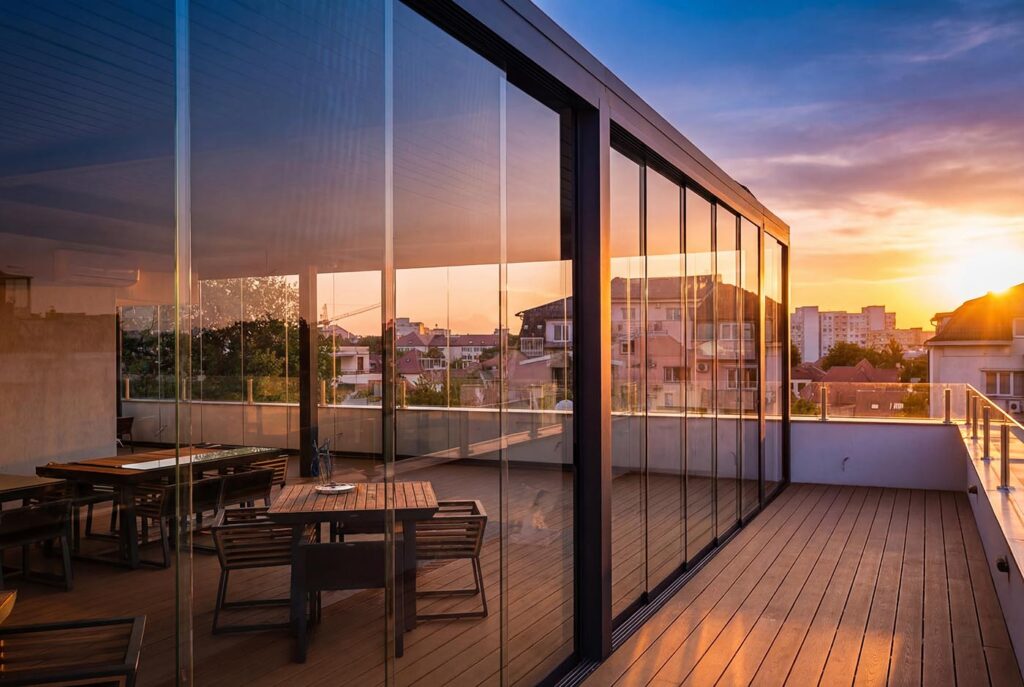 Glisante stânga-dreapta, ghilotină sau armonică. Profil de aluminiu discret, sticlă securizată. Terasa devine spațiu de locuit permanent.