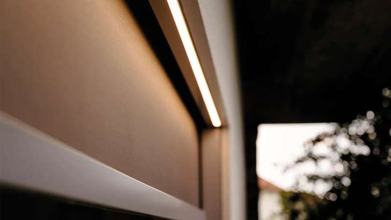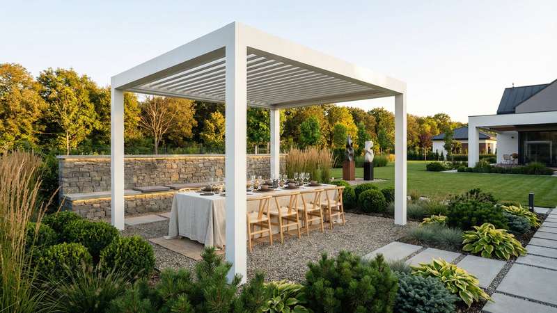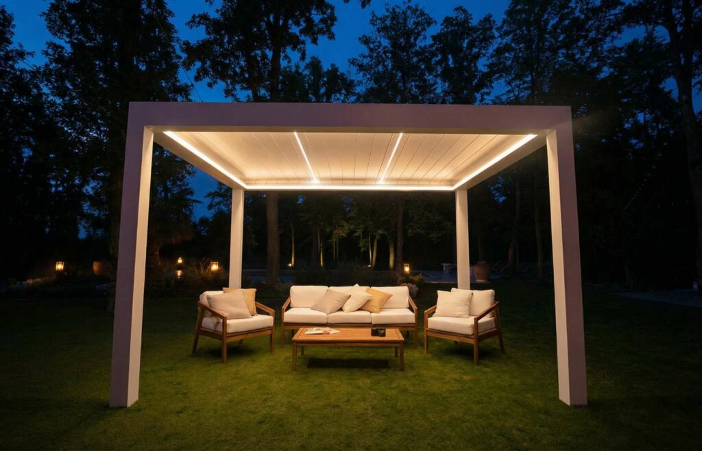 Lamele din aluminiu orientabile electric, drenaj integrat în stâlpi, senzori climatici. Spațiu exterior funcțional indiferent de anotimp.